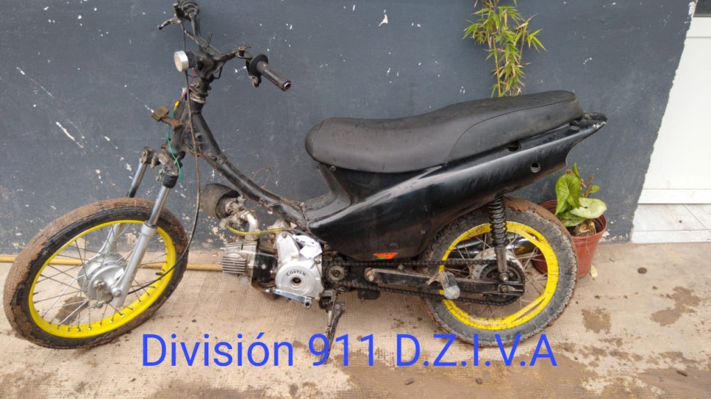 Metros antes de llegar al de domicilio de este se logra divisarlo, por lo que de inmediato se procede a aprehenderlo, el mismo es identificado y manifestó haber escondido el rodado denunciado como sustraído en un domicilio por calle W. Espinoza constituidos al lugar, se entrevistaron con un ciudadano de 41 añoos, quien manifestó que su hijo momentos antes fue conducido por la División de Investigaciones junto con la motocicleta en cuestión, también manifestó que su hijo hace varios días había dejado escondido en el patio trasero de su domicilio una motocicleta de dudosa procedencia por lo que,, para deslindar responsabilidad hace entrega de forma voluntaria de una motocicleta 110 cc. Color negro sin carenado, chasis N° visible (borrado) cuál se procede a secuestrar en legal forma, se trata de establecer su procedencia,