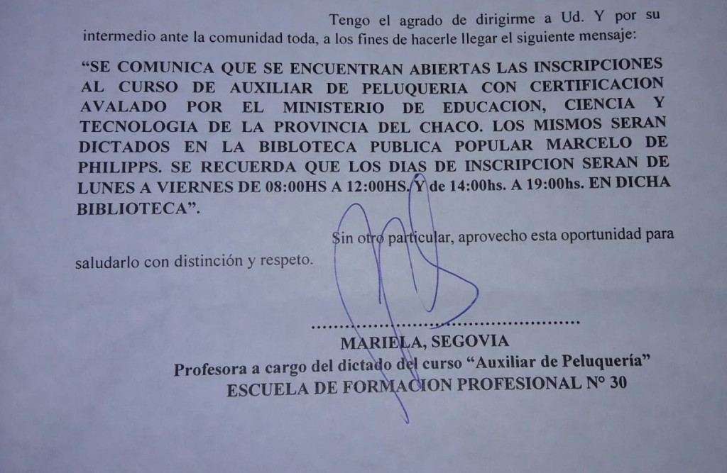 Se comunica que esta abierta la inscripcion al curso de Auxiliar de Peluqueria de lunes a viernes de 08:00 hs a 12:00hs en La Biblioteca de Philipps.
