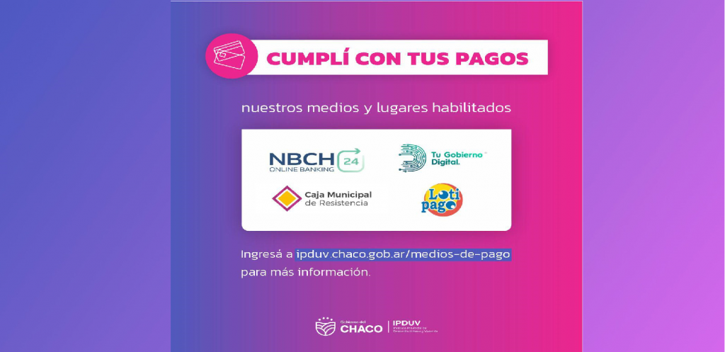 El Instituto Provincial de Desarrollo Urbano y Vivienda (IPDUV) recuerda a los beneficiarios la importancia de abonar sus cuotas en tiempo y forma para facilitar el acceso a la vivienda propia para más chaqueños. Para ello, el organismo ofrece una variada plataforma de medios de pago que permite la regularización o cancelación de cuotas.