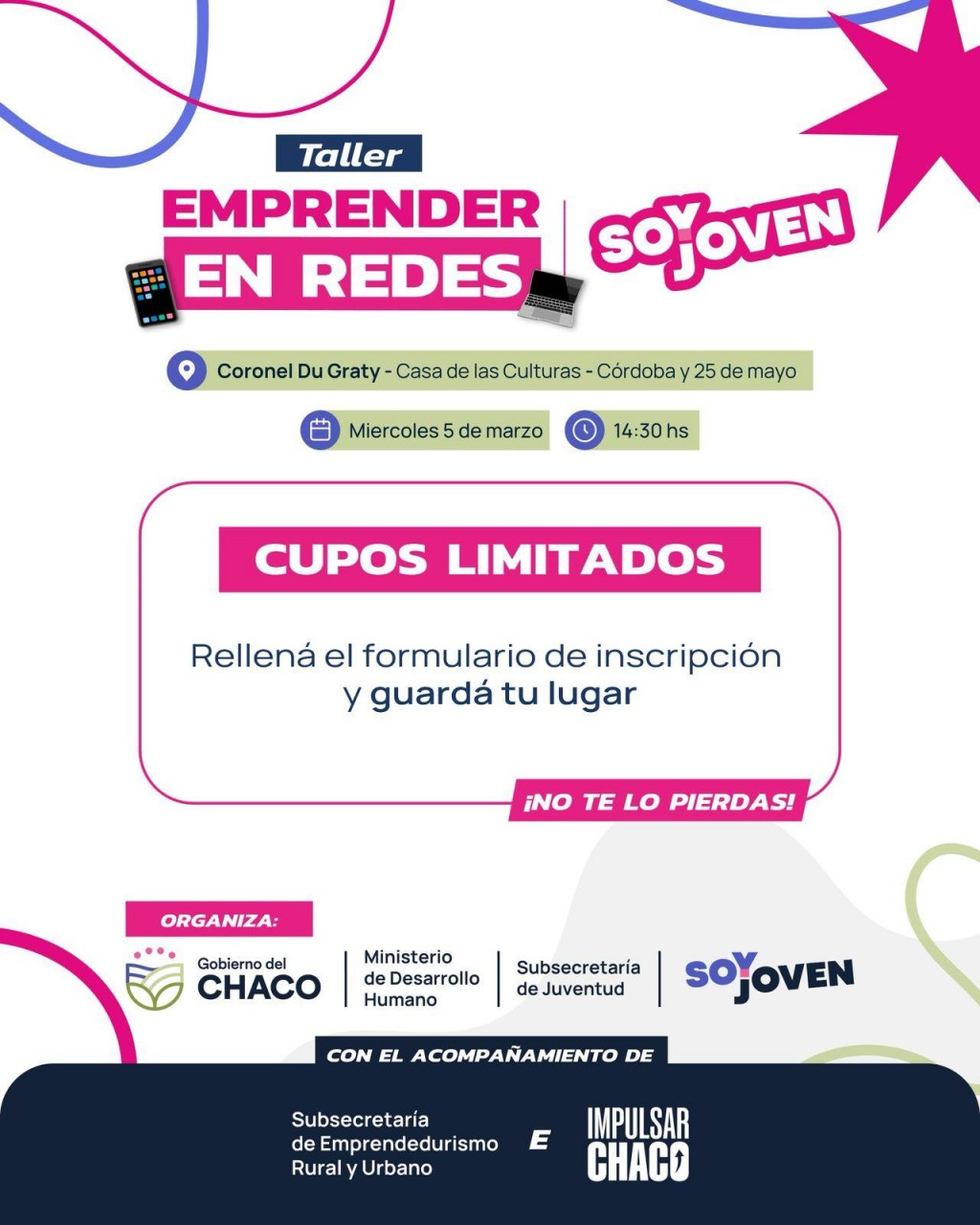 El Gobierno Provincial invita a la comunidad a participar de la primera edición del Taller “Emprender en Redes”, que se realizará el miércoles 5 de marzo en Santa Sylvina y en Coronel Du Graty. El taller, destinado a emprendedores de la provincia, busca brindar herramientas y estrategias para mejorar sus ventas y publicitar sus productos a través de redes sociales.