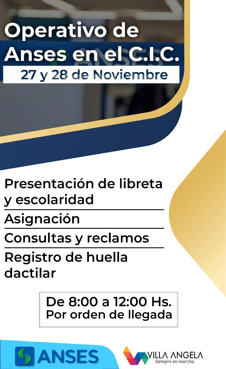 Desde la municipalidad de Villa Ángela y a través de la secretaría de Desarrollo Social se coordina con ANSES una jornada operativa que apunta a agilizar las consultas mediante la recepción de formularios libretas y otras documentaciones con el objetivo de descongestionar las oficinas t estar más cerca de los barrios. Se realizará los días miércoles 27 y jueves 28 en el CIC de la ciudad.