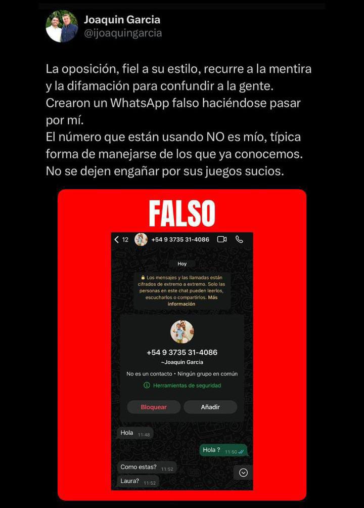JOAQUÍN GARCÍA ALERTÓ A LA SOCIEDAD QUE CIRCULA UN NÚMERO DE WHATSAPP QUE SE HACE PASAR POR ÉL