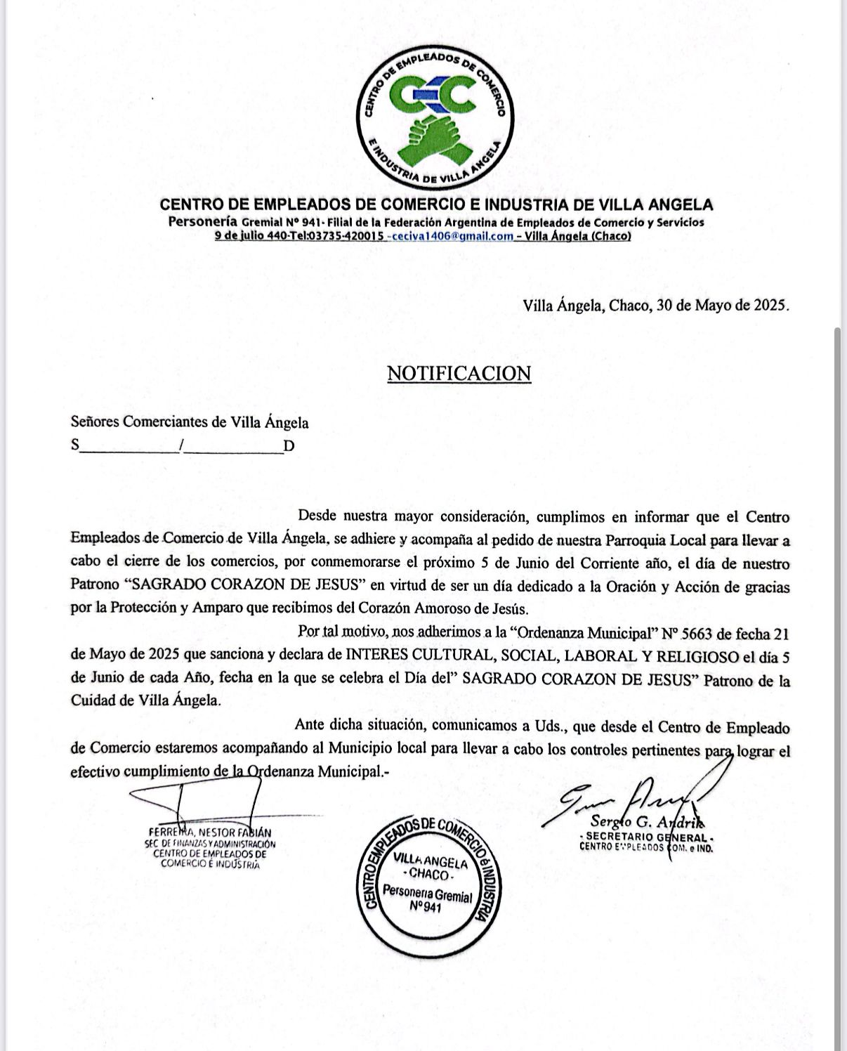 Sergio Andrik, Secretario General del Centro de Empleados de Comercio, informó a través de Radio Manantial 89.3mhz que el párroco local solicitó que el 5 de junio "Día del Patrono del Pueblo: Sagrado Corazón de Jesús" sea declarado asueto administrativo municipal.