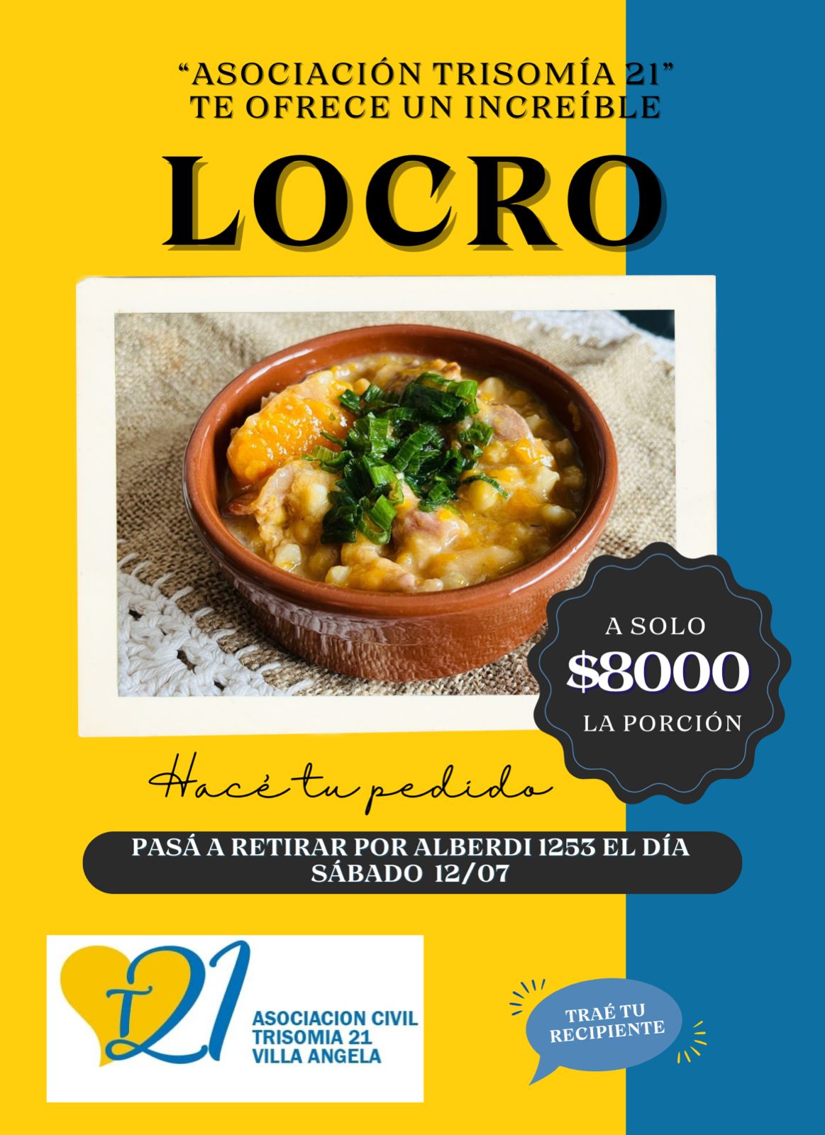 El presidente de la Asociación Trisomía 21 Villa Ángela, Gustavo Aguirre, mediante comunicación telefónica con Radio Manantial 89.3mhz informó a la comunidad que se lanzó una venta de locro para este sábado 12, el valor es de 8 mil pesos y se retira desde Alberdi 1253 (llevar recipiente).