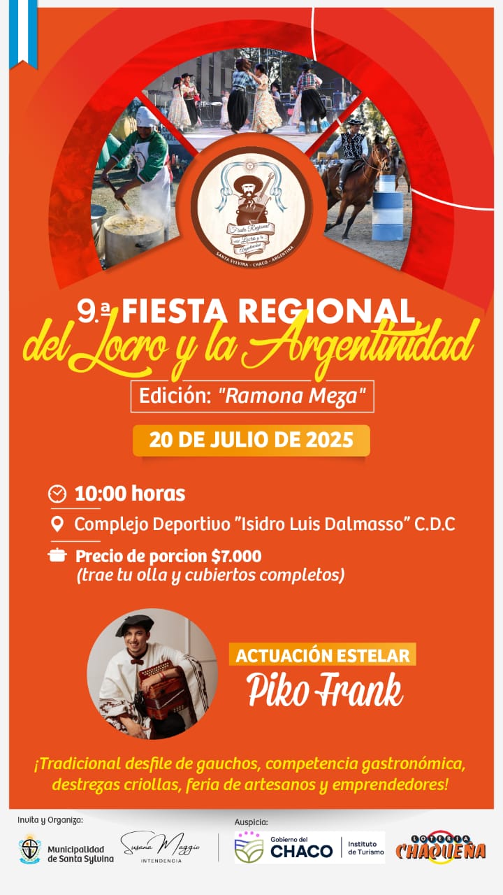 La intendenta de la ciudad de Santa Sylvina, Susana Maggio, informó que el 20 de julio se realizará la 9na Fiesta Regional del Locro y la Argentinidad, edición Ramón Meza, a las 10:00 en el Complejo Deportivo "Isidro Luis Dalmasso" del Club Deportivo Comercio, con la actuación de Piko Frank. El costo de la porción será de 7mil pesos y se debe llevar olla y cubiertos completos.
