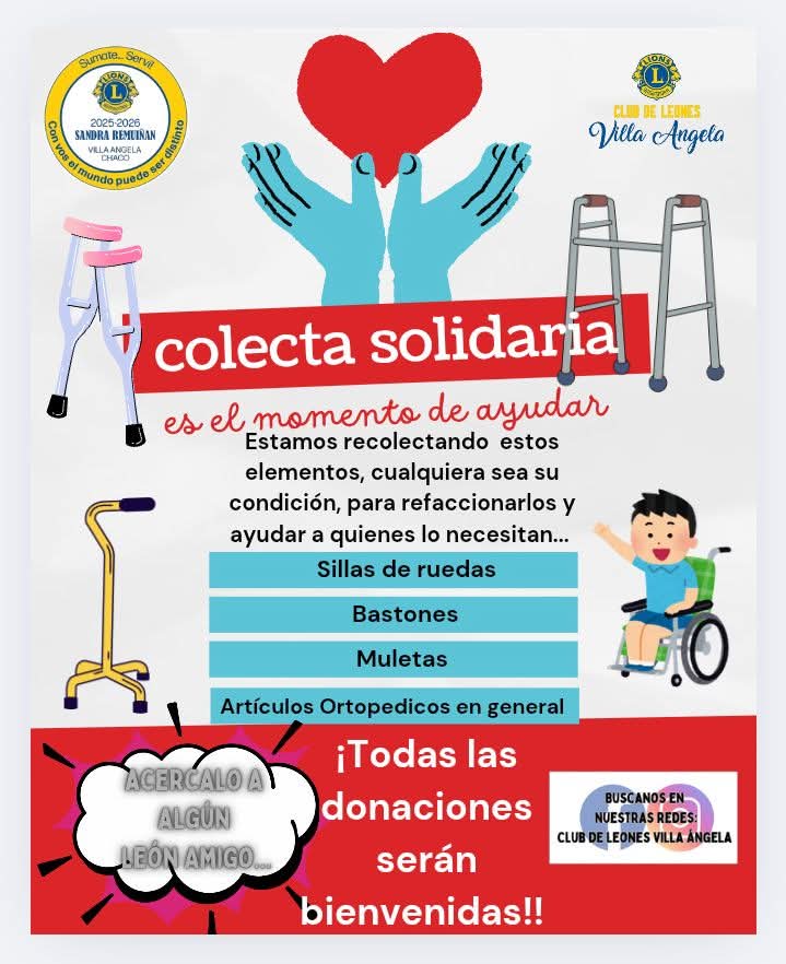 La presidenta del Club de Leones de Villa Ángela, Sandra Remunian, se comunicó telefónicamente con Radio Manantial 89.3mhz para informar sobre el lanzamiento de una campaña solidaria que consiste en la recolección de sillas de ruedas, bastones, muletas, colchón anti escaras, artículos ortopédicos en general, cualquiera sea su condición, para refaccionarías y ayudar a quiénes más lo necesitan.