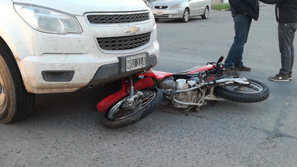 El día de la fecha a la hora 10am. aproximadamente se toma conocimiento de un Acciente de tránsito en intersección de Av. Bittel y Obligado de la ciudad de Villa Ángela, constatándose presencia en el lugar a una camioneta Chevrolet, Luv, Cabina simple, C/Blanca, conducida por M. H. D., de 42 años, y una motocicleta Gilera, 110 Cc. C/Azul, sin dominio, guiada por G. L. R. de 44 años, quien presentaba un (dolor en el codo izquierdo).
