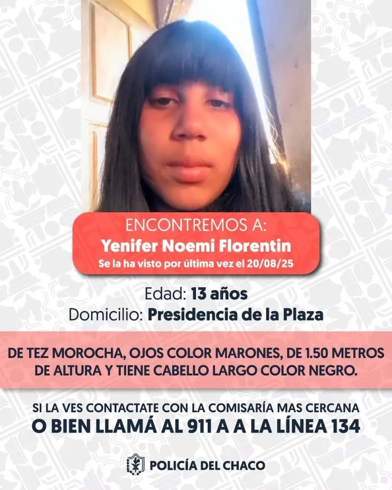 La Policía del Chaco desplegó un amplio operativo para dar con el paradero de Yenifer Noemí Florentín, la adolescente de 13 años que permanece desaparecida desde el miércoles pasado. Desde las primeras horas del domingo, efectivos de distintas divisiones trabajan en simultáneo en varias localidades de la provincia.