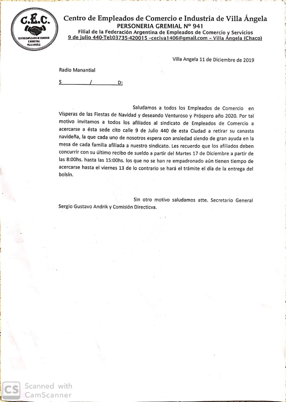 VILLA ÁNGELA: EL CENTRO DE EMPLEADOS DE COMERCIO INVITA A RETIRAR SU CANASTA NAVIDEÑA