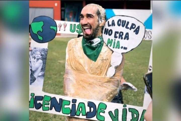 El joven, llamado Tom�s Vidal, se mostr� envuelto en pl�stico, con una soga en el cuello y un pa�uelo verde, junto a un cartel que dec�a: "la culpa no era m�a".