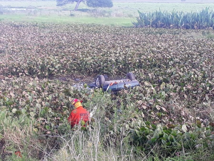 Este domingo, a las 8 aproximadamente, fueron alertados de la existencia de un vehículo con las cuatro ruedas hacia arriba en un desagüe a la vera de la Ruta 16.