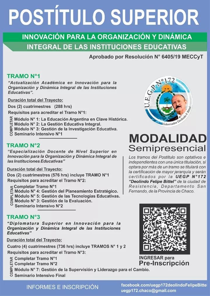 El Post�tulo ?Innovaci�n para la Organizaci�n y Din�mica Integral de las Instituciones Educativas?, es una oferta presentada por la UEGP N�172 ?Deolindo Felipe Bittel?, de la provincia del Chaco a ser implementado en las localidades de Puerto Barranqueras, Colonia Elisa, Makall�, Presidencia Roque S�enz Pe�a, Pampa del Infierno, Villa Berthet, Machagai, Laguna Blanca, Pampa del Indio, Villa �ngela, Tres Isletas, Resistencia, San Bernardo, Colonias Unidas, Juan Jos� Castelli, Corzuela, General Pinedo, Quitilipi,� Charata, Las Bre�as, Fontana, General San Mart�n, Las garcitas, Hermoso Campo, Capit�n Solari, La Leonesa y Nueva Pompeya.