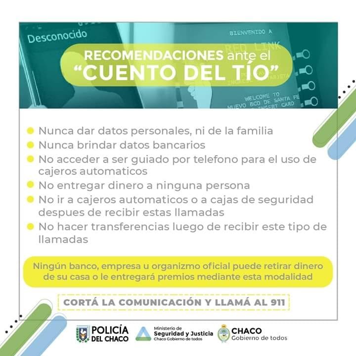 LA POLICÍA DE LA PROVINCIA DEL CHACO PROMOCIONA RECOMENDACIONES PARA EVITAR "EL CUENTO DEL TÍO"