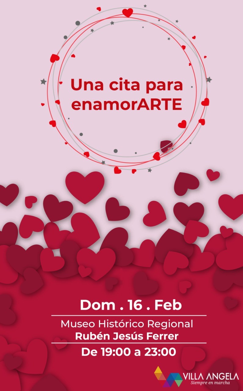 La Municipalidad de Villa Ángela en conjunto con el Museo Histórico Regional Municipal y la Revista Fabularia, invitan al evento “Una cita para enamorARTE” el cual se desarrollará de forma gratuita este domingo 16 de febrero de 19 a 23 hs. Se celebrará el día de San Valentín con presentaciones artísticas y muchas sorpresas.