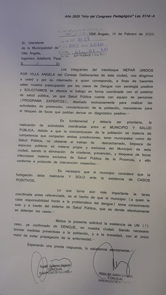 Atentos a que la semana pasada los concejales del NEPAR Y UNIDOS POR VILLA ANGELA, solicitaron al municipio que se encarguen de trabajos de descacharrados, y medidas de prevenci�n ante un inminente brote de DENGUE. El D�a de la fecha, han presentado nuevamente una solicitud de que, ante los casos positivos dados en la ciudad, se trabaje y se solicite en forma conjunta con el Gobierno Provincial, ante la pronlem�tica, ya que Provincia tiene los Recursos y personal id�neos para tratar la situaci�n (Programa Expertos). Etimando como fundamental el trabajo en coordinaci�n con Salud P�blica de actividades de Concientizaci�n, descacharrado y limpieza de espacios p�blicos, ya que ambos entes p�blicos tienen competencia en la materia.