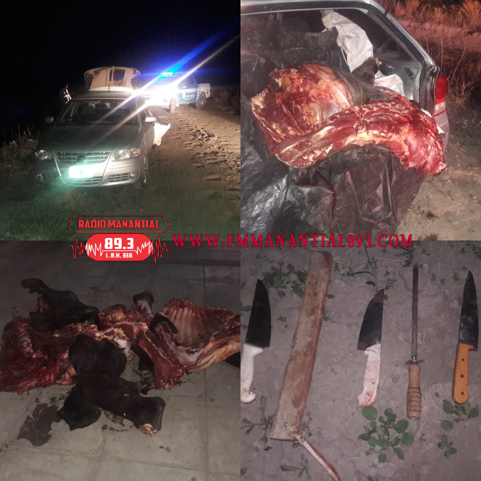 El personal de la comisaria de Santa Sylvina, que se encontraba llevando a cabo servicio de recorrida y prevención en Colonia EL TIGRE, observó a CUATRO cuatro personas de sexo masculino que se hallaban faenando un animal vacuno, de pelaje negro, a la vera de un camino rural, usando como herramientas CUATRO Cuchillos y UNA Chaira, en un medio de transporte, Automóvil marca VOLKSWAGEN GOL, gris, en el cual se hallaban trozos carne en el baul.