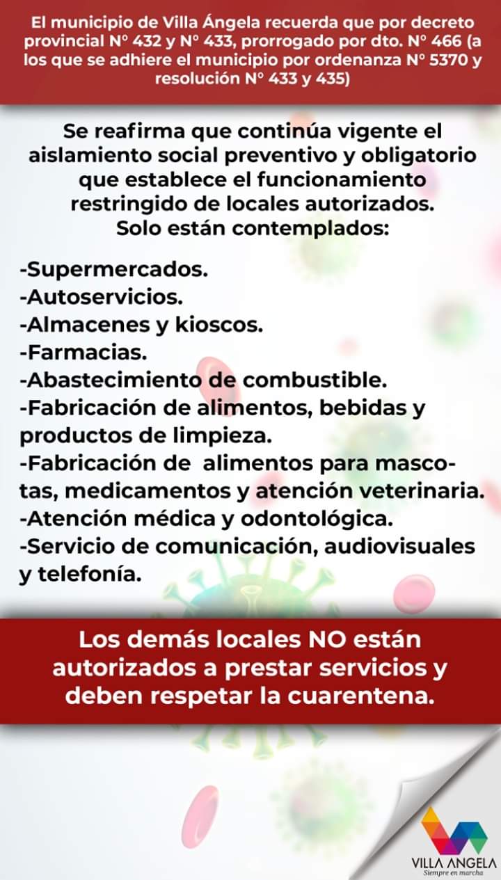 La Municipalidad de Villa Ángela, a través del Servicio de Bromatología, recuerda a la comunidad la vigencia del aislamiento social, preventivo y obligatorio establecido por el Decreto provincial N° 433 y prorrogado por el Decreto N° 466 (a los que adhiere la Ciudad por ordenanza N° 5370 y Resolución N° 433 y N° 435)