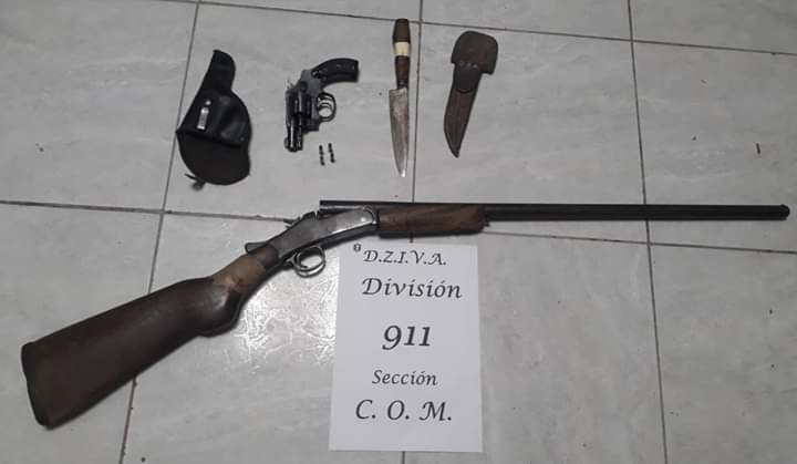 Al llegar al lugar observan a dos masculinos promoviendo desorden en la vía pública, uno de ellos poseía en sus manos un arma de fuego larga, el cual intenta darse a la fuga, procediendo a la aprehensión de B. A. D. de 42 años, quien tenía en sus manos un arma de fuego, una escopeta de Calibre 16, y posteriormente al realizar el cacheo, este tenía entre sus prendas de vestir un arma de fuego, Revolver calibre 22, color negro, un cuchillo de 15 cm largo.