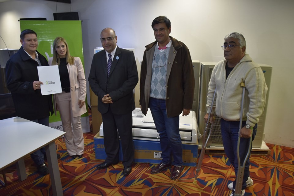 Emilse Nanoff Penoff junto al Subsecretario de Desarrollo Local, Aldo Alberto Almiron, concretaron la entrega de tres equipos de aire acondicionado a la Escuela de Educación Primaria N° 663 y dos a la Asociación de Comparsa Ara Sunú.