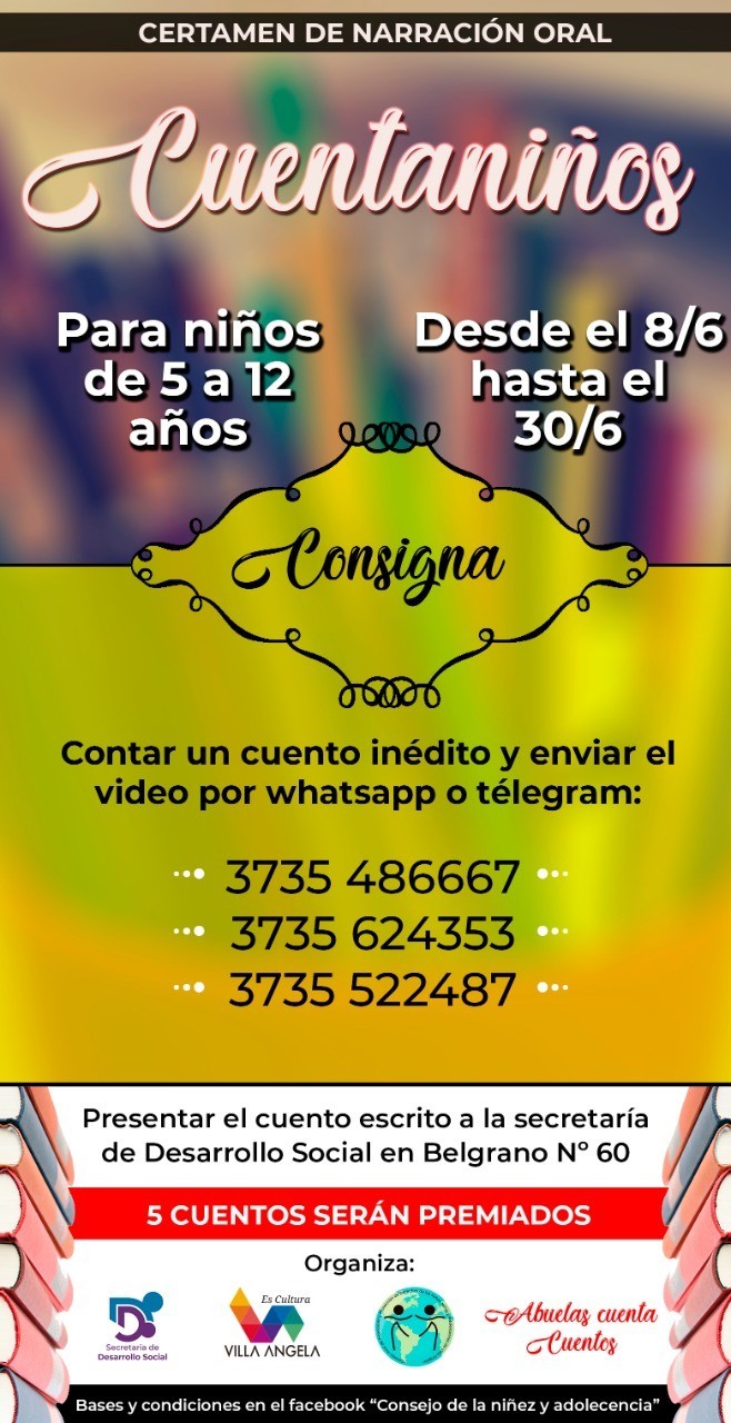 La Municipalidad de Villa Ángela, por medio de la Secretaría de Cultura, Turismo y Deportes y la Secretaría de Desarrollo Social, invita a los niños y adolescentes de la comunidad a participar del concurso de narración oral “Cuentaniños” el cual dará inicio el lunes 8 hasta el martes 30 de junio en el marco de la celebración “Día del libro”. El concurso está destinado a todos los niños de 5 a 12 años.