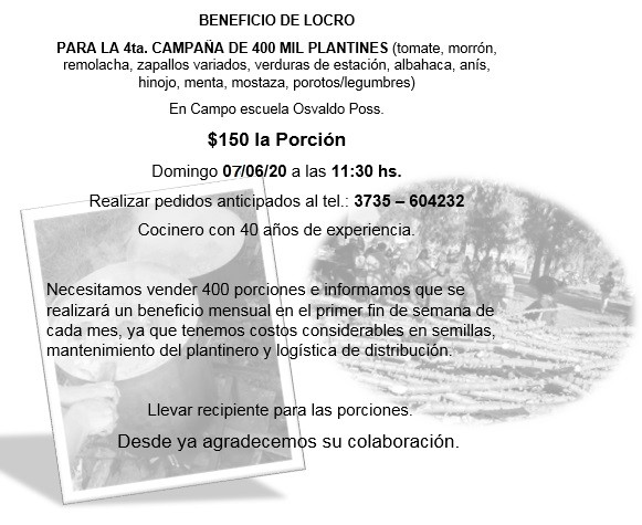 El domingo 7 de Junio, en el Campo Escuela Osvaldo Poss, realizarán un beneficio para llegar a la compra de 400 mil plantines para ser entregados en la próxima campaña de manera gratuíta.