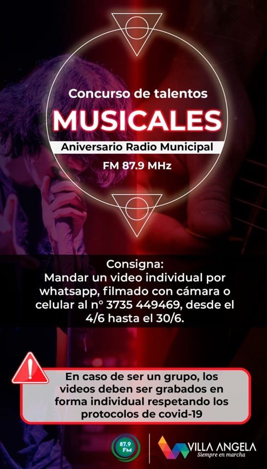 La Municipalidad de Villa Ángela, a través de la Secretaría de Planificación y Tecnología, invita a todos los músicos de la comunidad a participar del concurso de "Talentos Musicales" en el marco de la celebración por el 5° Aniversario de la Radio Municipal 87.9 MHz. Los artistas, tendrán la posibilidad de ser convocados para difundir sus trabajos en los medios de comunicación del municipio.