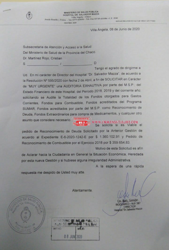 El Director del hospital “Salvador Mazza” solicitó al Ministerio de Salud, que realicen una auditoría por el manejo de fondos del Hospital y expresó “EL QUE NADA DEBE, NADA TEME”