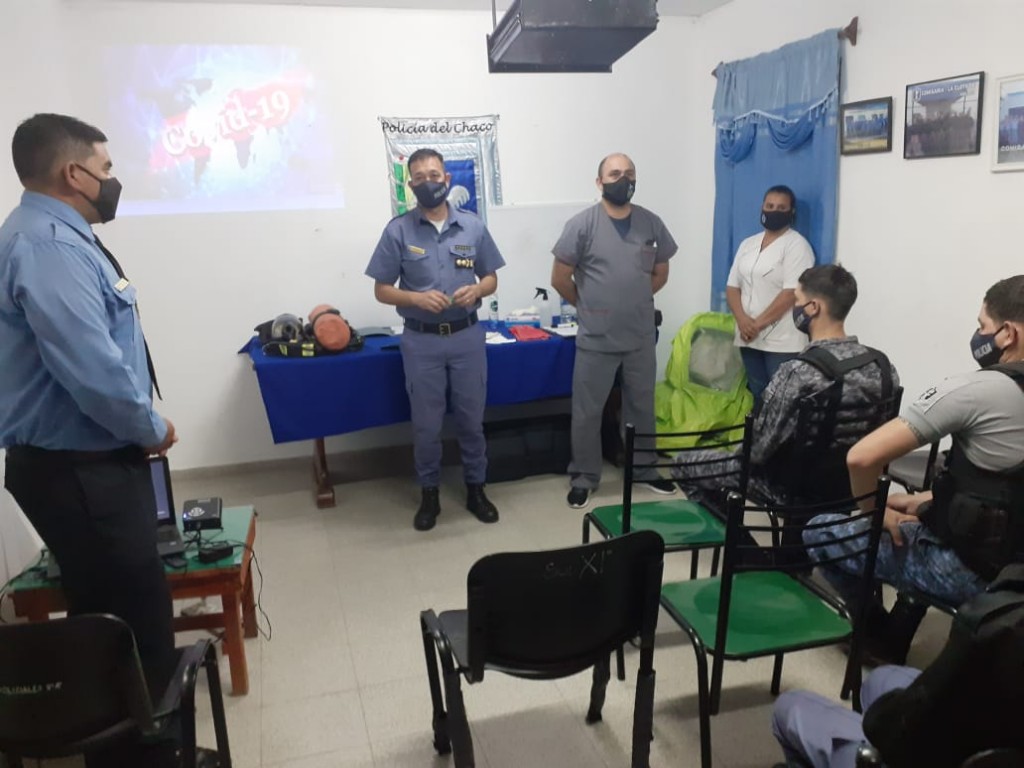 Se contó con la presencia de personal policial local dependiente de la Dirección de Zona, donde el personal de Medicina Legal, el Cabo 1° Marinelli Ariel y el Agte. Yedro Yanina abordaron los temas de Covid-19, en temas como, síntomas, cuidados y medidas de bioseguridad (guantes, barbijos desinfección de elementos cotidianos), el personal de Bombero a cargo, el Oficial Principal Dure Alejandro donde abordaron los temas del virus causal de la enfermedad COVID-19, una reseña histórica del virus, definición, elementos y medidas de Bioseguridad, demostración de trajes de protección, etc.