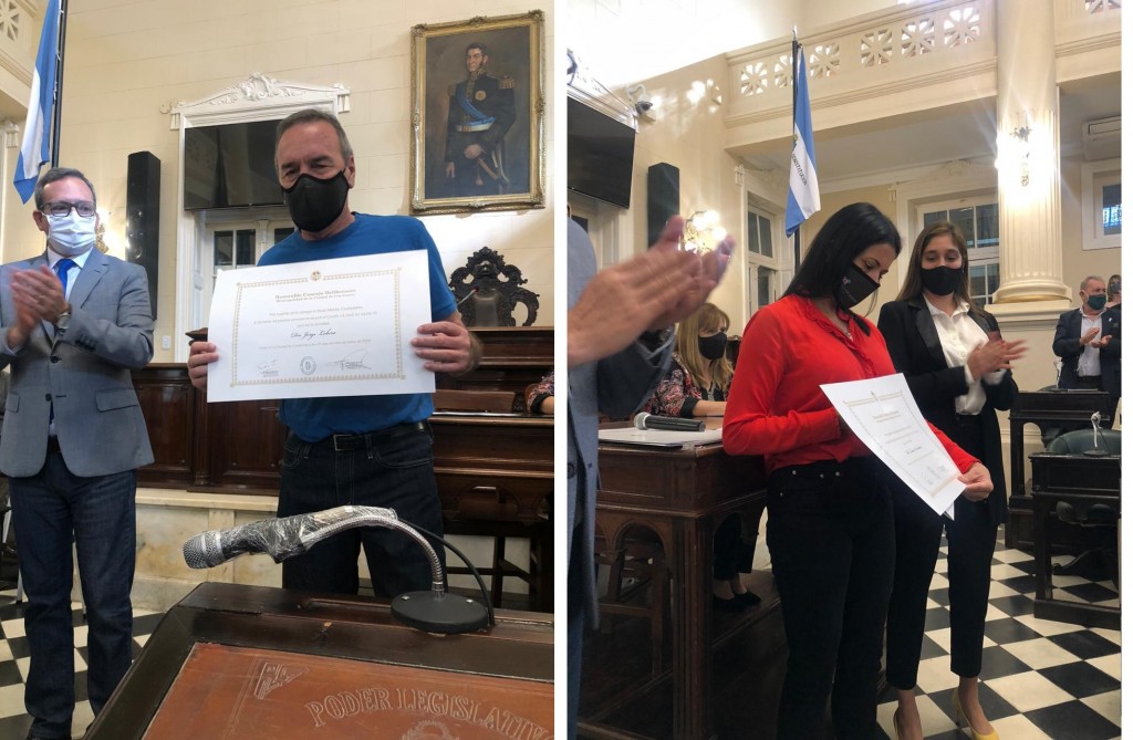 Los Villangelenses Jorge Lobera y su esposa Lorena Avendaño, fueron reconocidos y/o distinguidos como MÉRITO AL CIUDADANO CORRENTINO, por ser parte del grupo de voluntarios que donaron plasma convalecientes luego de recuperados del contagio de COVID-19, para el tratamiento a pacientes que contrajeron la enfermedad.