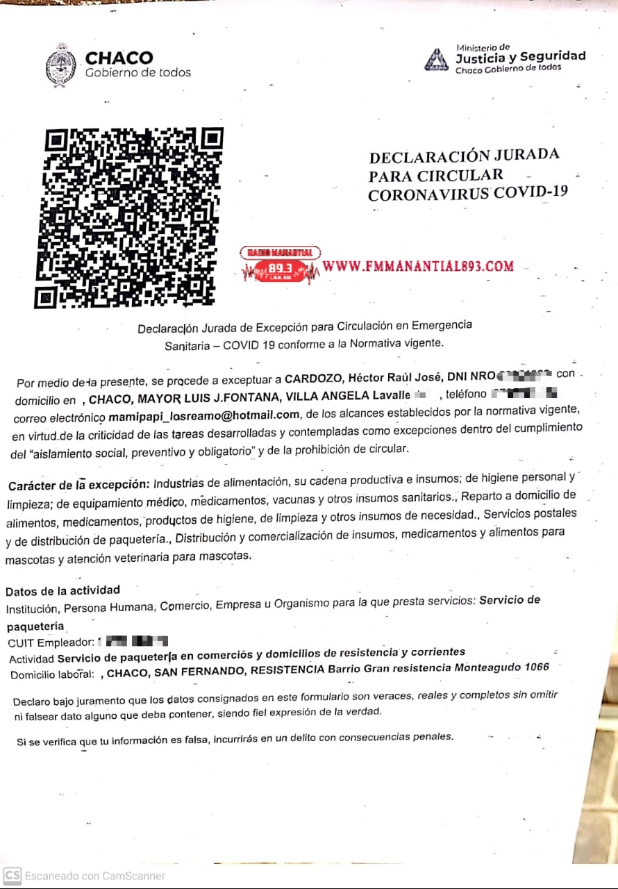 Con respecto a lo que se decía de que había trasladado una persona de Fontana a Quitilipi, dijo: “Yo contacté con esa persona en el transcurso de la mañana, esa persona quería volver a la ciudad de Quitilipi porque no tenía trabajo y me pidió si lo podía traer él tenía para circular, de hecho voy a aclarar que en esa mañana también tengo en los mensajes, que fue público, que en La Clotilde mataron un chico de 21 años y la hermana quería venir porque le estaban por quemar la casa a su papá, también le dije lo mismo, si vos tenés el permiso te hago el favor y te llevo, porque sentía, sentí y siento que mi vehículo,  no voy a decir a que persona ayudé y llevé, personas de la policía, de Gendarmería y personas de la salud que necesitaron ir de un lado a otro. Y si tenés el permiso, tenés un problema de salud o de oncología, llevé, pero he hecho es que siempre llevé, nunca traje, a ese chico decidí traerlo porque tenía un problema familiar, lo habían corrido y no tenía donde vivir y me dijo si lo podía alzar y traer hasta la ciudad de Quitilipi pero no lo encontré, esa es la verdad, esa es la realidad”.