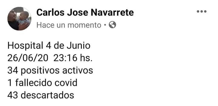 El Director del Hospital 4 De Junio de la localidad de Saenz Peña informó en su cuenta de Facebook personal, la cantidad de casos contabilizados hasta el momento.