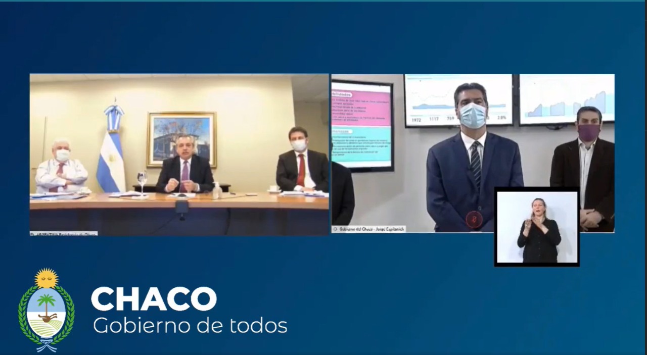 El gobernador Capitanich present� v�a teleconferencia ante el presidente Alberto Fern�ndez, un informe pormenorizado de las acciones de su gesti�n en el marco de la emergencia sanitaria por COVID-19. En su discurso, agradeci� el acompa�amiento nacional, y se dirigi� a las y los chaque�os: ?Sabemos que hay saturaci�n social y sabemos del cansancio de las y los trabajadores de la salud. Estamos aqu�, firmes, haciendo el m�ximo esfuerzo para cuidar de todos?, asegur� el mandatario provincial.