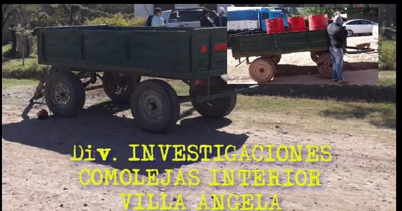 En el d�a de hoy, prosiguiendo la tarea investigativa en la causa, conforme a testimonios recabados, se pudo establecer un acoplado dos ejes color verde utilizado para cargar tachos de aceite que fuera fotografiado por el damnificado al momento hecho, donde el mismo, estar�a en un domicilio del Barrio Escalada, contando con Oficio judicial para secuestro se procedi� a la b�squeda logrando ubicar al mismo en un domicilio sito calle Edison entre Carabelas y 3 de febrero, donde se procedi� al secuestro del citado rodado trat�ndose de un ACOPLADO de dos Ejes de color verde.
