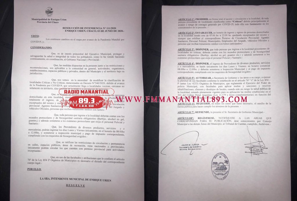 En dicha resolución prohíbe totalmente el ingreso de personas proveniente de zonas críticas respecto de la Emergencia Sanitaria por Covid-19.
