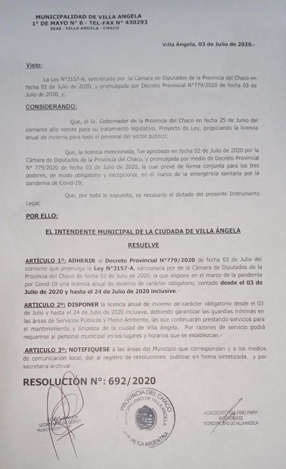 El Municipio de Villa Ángela en base a la Resolución N° 692/2020 adhiere al Decreto Provincial N° 779/2020, el cual dispone, en el marco de la pandemia por Covid- 19, una licencia anual de invierno de carácter obligatorio desde el viernes 3 hasta el 24 de julio.