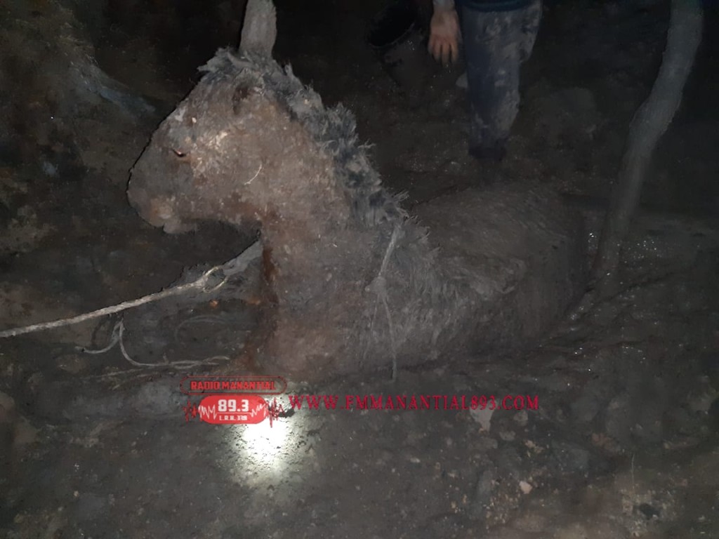 Partió al lugar una dotación bomberos en autobomba A-4, donde arribados al lugar, se constata de un equino macho de pelaje colorado en pozo desbordado, el cual contenía gran cantidad de barro.