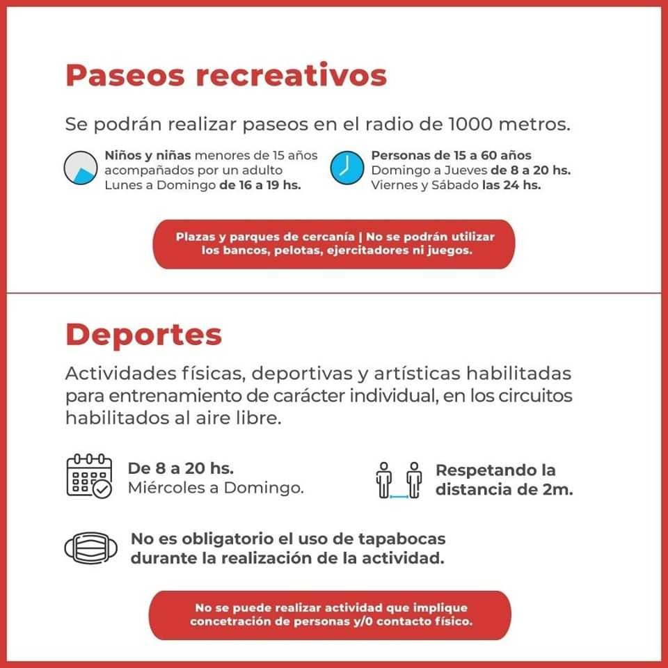 Con una serie de flyers, el Municipio, en concordancia con el gobierno y diferentes actores del quehacer social, menciona que en lo que refiere a paseos recreativos solo se habilitará en un radio o distancia que no supere los 1000 metros del domicilio de cada persona para niños y niñas de hasta 15 años acompañados por un mayor, durante toda la semana de 16 a 19; y para personas entre 15 a 60 años de edad, que no integren grupos de riesgo, de domingos a jueves de 8 a 20 y viernes y sábados las 24 horas.