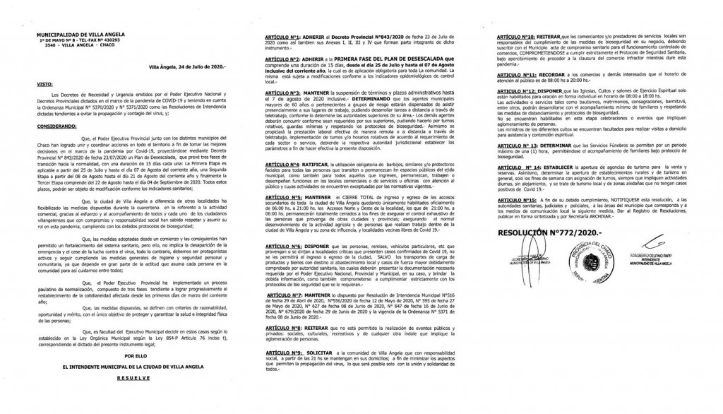 El Municipio de la Ciudad de Villa Ángela en cabeza del Ejecutivo Adalberto "Titi" Papp, por medio de un comunicado en la red social Facebook, comunicaron la Resolución N° 772/20, el cual adhiere las medidas de la Fase 1 del Decreto de Desescalonamiento del Gobierno provincial, pero sujeto a modificaciones que dependerán de la situación epidemiológica local.