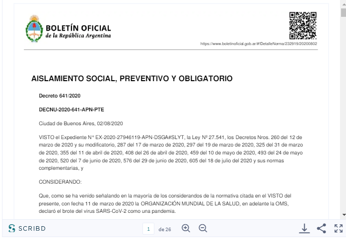 El DNU se dictó con el "objeto de proteger la salud pública, lo que constituye una obligación indelegable del Estado nacional en el marco de la declaración de pandemia emitida por la Organización Mundial de la Salud (OMS), con fecha 11 de marzo de 2020, y de la emergencia pública en materia sanitaria ampliada por el Decreto N° 260/20 y su modificatorio, y en atención a la situación epidemiológica existente en las distintas regiones del país con relación a la COVID-19", dice el texto.