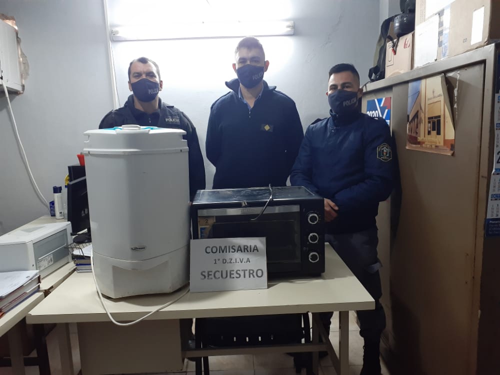 Respecto de las actuaciones iniciadas en base a denuncia de la Sra. *I. V. B. De 31 a�os, quien aduce que en fecha 16 dw agosto a horas 09.20� mediante arduas tareas investigativas y rastrillaje a pie, realizado por el personal de comisaria Primera, logr� el recupero de lo denunciado como sustra�do *( Un Horno El�ctrico y un Seca ropas)*, los elementos se encontraban ocultos entre las malezas a cercan�as del domicilio donde ocurri� el hecho.