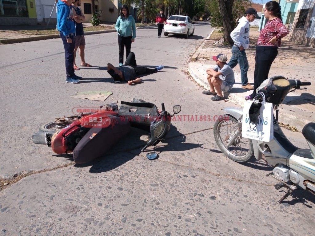 En la siesta de hoy siendo las 14:45 hs. se toma conocimiento de un accidente de tránsito Sobre calle Moreno y Belgrano de la ciudad de Villa Ángela, Constituida la Prevención policial, corrobora que (01) Motocicleta marca Gilera Smash 110 cc, color Roja, quién era Guiada por el ciudadano G. J. S. de 23 años, colisionó contra un automóvil marca Toyota Corolla, color Blanco guiado por el ciudadano B. I. B. de 38 años.