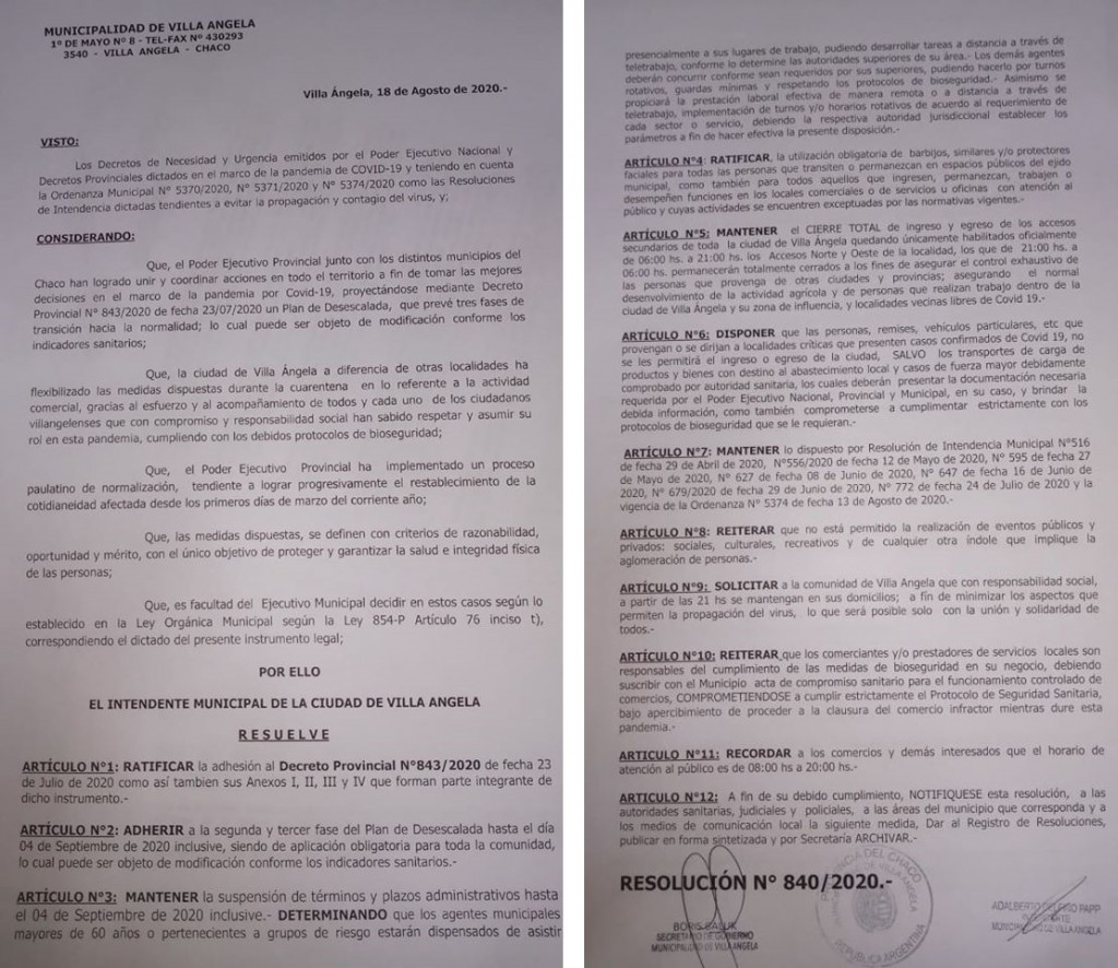 El Municipio de Villa Ángela en base al Decreto Provincial