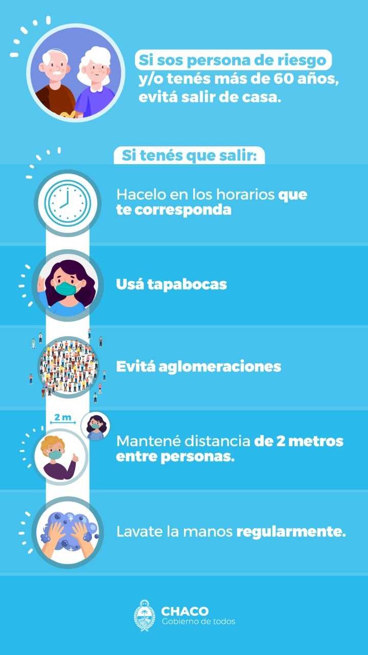 Para la concurrencia a restaurantes y bares, se deberán disponer de horarios especiales para grupos de riesgo, permitiéndose en el horario de 8 a 10 y de 16 a 18, solo en sectores al aire libre.