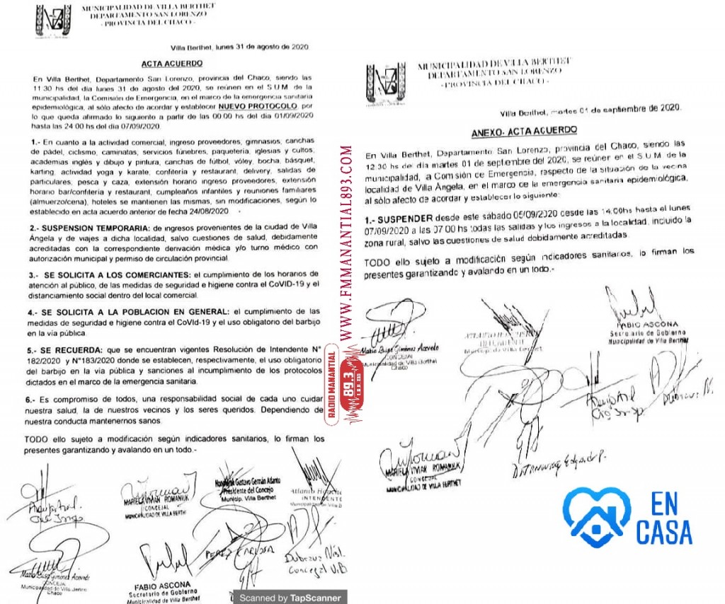Tras el brote de Coronavirus en Villa Ángel, el Municipio de Villa Berthet, no hizo esperar la toma de decisiones y la publicación del acta acuerdo el cual comenzó a regir a partir de las 00 hs. del día 1 de septiembre hasta las 24:00 horas del día 7 de septiembre del 2020.