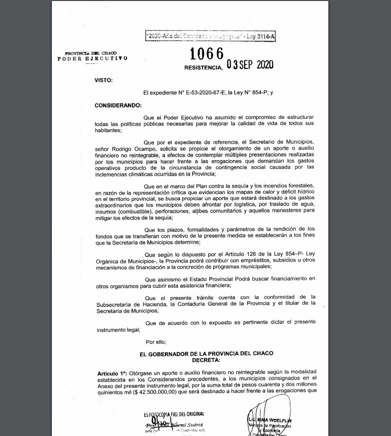 El gobernador Jorge Capitanich suscribió, este viernes, el decreto N°1066 que establece la primera etapa de transferencia directa a los municipios en el marco del Plan contra la sequía e incendios forestales. Se trata de 42.5 millones de pesos en aportes financieros no reintegrables para afrontar gastos extras por sequía e incendios.