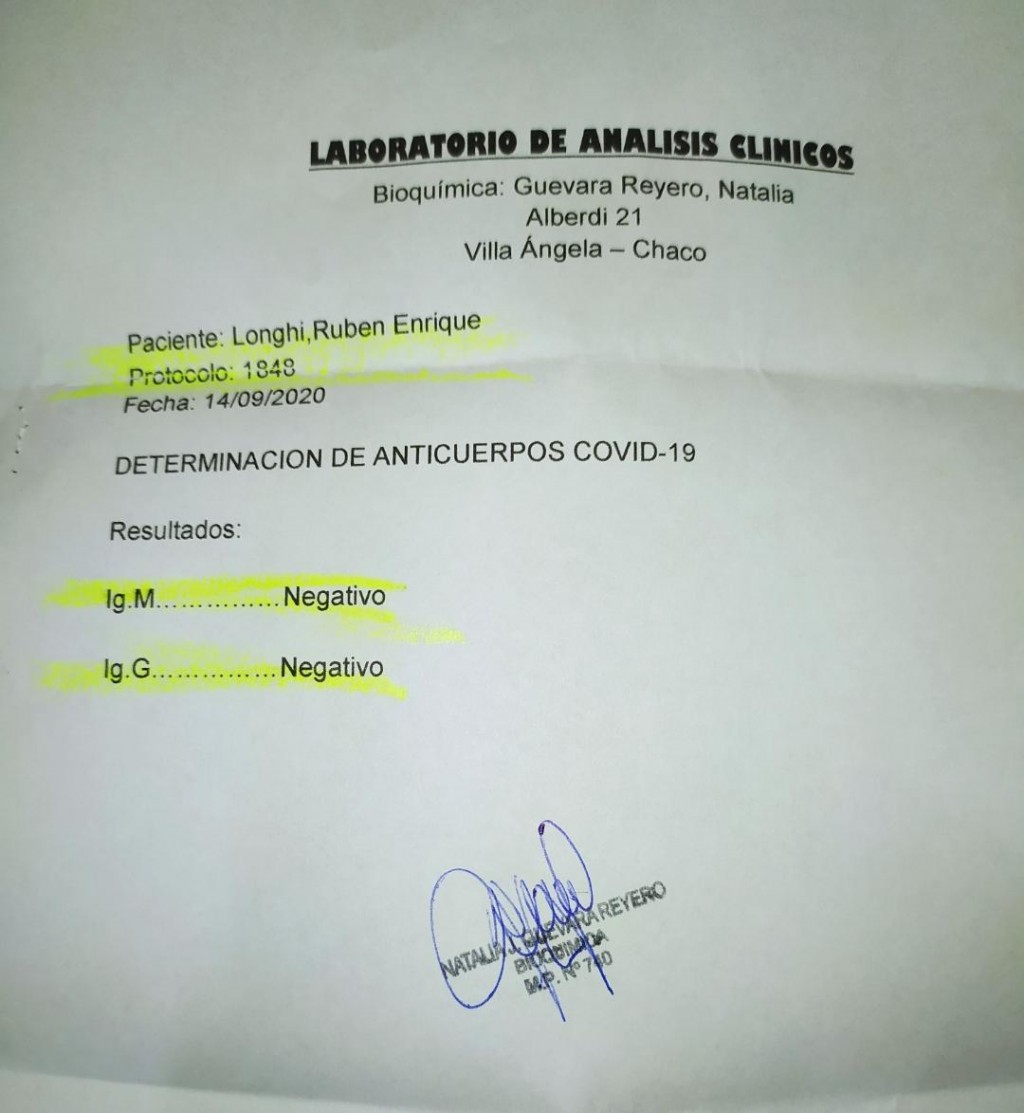 En horas de la mañana se realizó un test rápido, en un laboratorio de la ciudad, el cual arrojo resultado NEGATIVO PARA COVID.