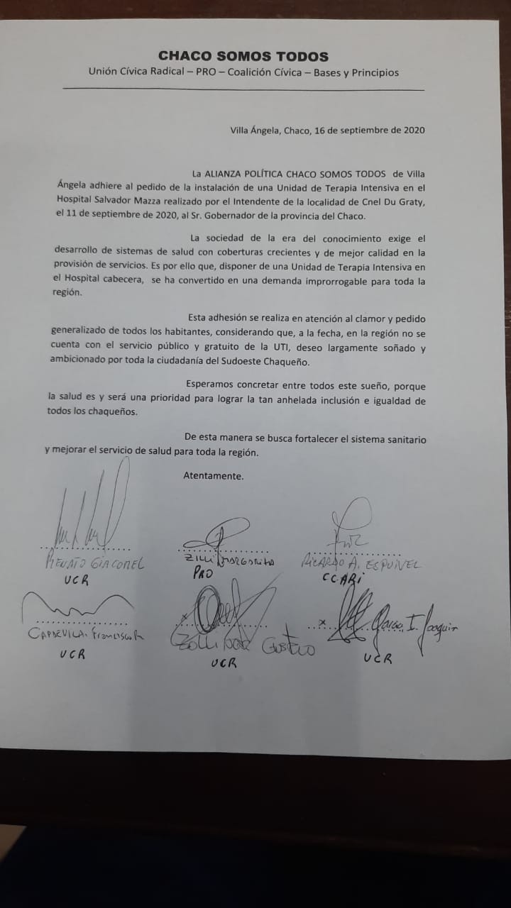 Manifiestan que “ esta adhesión se realiza en atención al clamor y pedido generalizado de todos los habitantes, considerando que a la fecha, en la región no se cuenta con el servicio público y gratuito de la UNIDAD DE TERAPIA INTENSIVA, deseo largamente soñado y ambicionado por toda la ciudadanía del Sudoeste Chaqueño”.