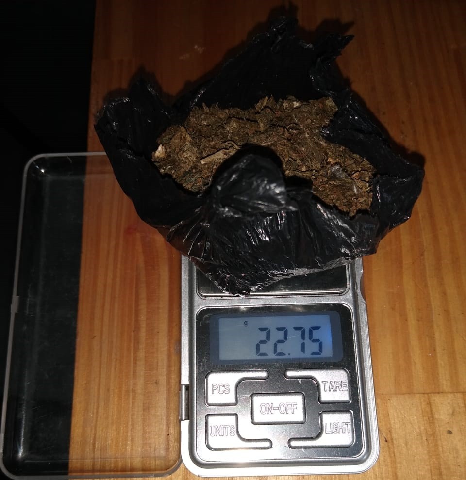 Ya en el lugar se realizó el pesaje y prueba de campo sobre la sustancia hallada siendo (01) envoltorio de polietileno de color negro con una sustancia verde amorronada en forma disgregada arrojando como resultado 22,75 GRAMOS POSITIVO A CANABIS SATIVA "MARIHUANA".