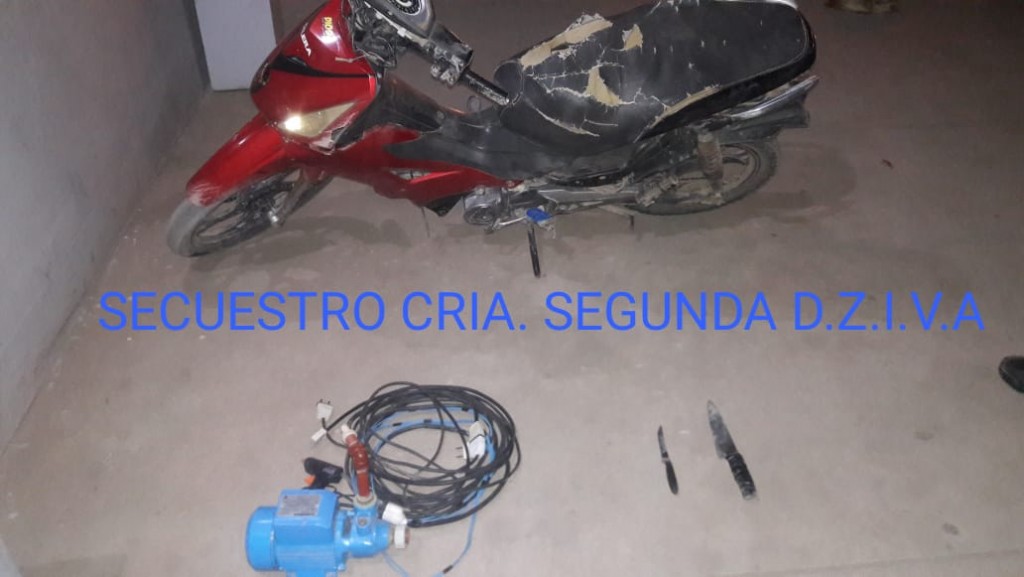 En la madrugada de hoy siendo las 01:20 hs. aproximadamente, el personal policial se hallaba en recorrida de prevención por Av. L. N. Alem y Los Andes ésta, momento en que visualizan a dos sujetos masculinos a bordo de una motocicleta 110 cc., color roja, que al notar la presencia policial, emprenden fuga, siendo interceptados en Av. Boulevard San Martín y Necochea, los mismos dijeron ser L. E. S. de 22 años, y R. M. M. de 22 años, al verificar el rodado marca GILERA SMASH, 110 cc., de color rojo, sin dominio, se observa en el interior del baúl (01) Una Bomba centrífuga de agua, color azul, marca GAMMA, de ½ HP, con cable de color negro y azul de dudosa procedencia, de lo cual no supieron acreditar la propiedad y (02) Cuchillos, procediéndose al formal SECUESTRO.