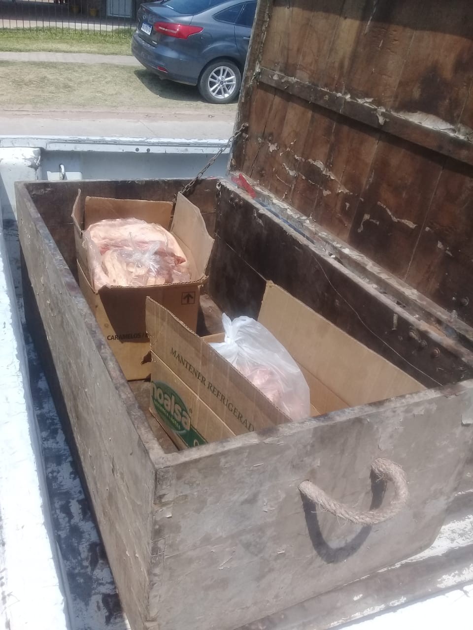 Constituida la comisión policial, corrobora la veracidad, hallándose presente los Inspectores mencionados, quienes ratificaron la información, observando una camioneta Ford Ranger doble cabina, color gris, dominio, con un único ocupante: L. D. S. de 49 años, del Lote 7 de la localidad de La Clotilde, quién reconoció la transacción comercial, se constató por la ventanilla de la Pick Up (2) cajas de cartón con bolsas de Nylon con carne, mismo no acreditó la propiedad, tampoco contaba con cadena de frío, haciendo entrega voluntaria de (2) cajas de cartón conteniendo un total de 14 kg. de Carne porcina, fraccionadas en (8) bolsas; 9 kg. de Chorizo y 4 kgs. de costeletas, y (1) baúl de madera con manchas rojizas simil sangre, desde la caja del vehículo, cuales se procedió al secuestro.